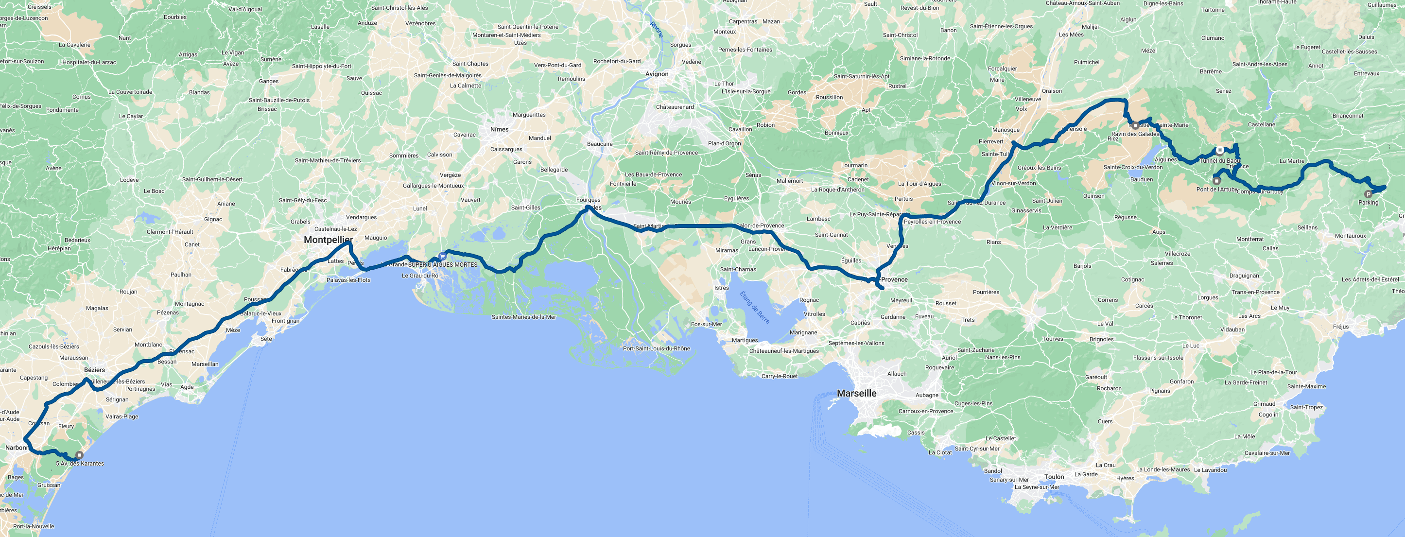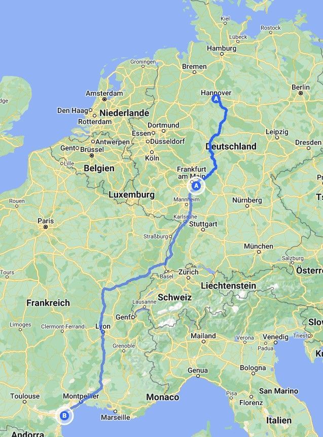 Strecke B Frankfurt -> Narbonne Plage: ca. 1090km (10h 45m, wenn man durchfährt, aber wer macht das schon).